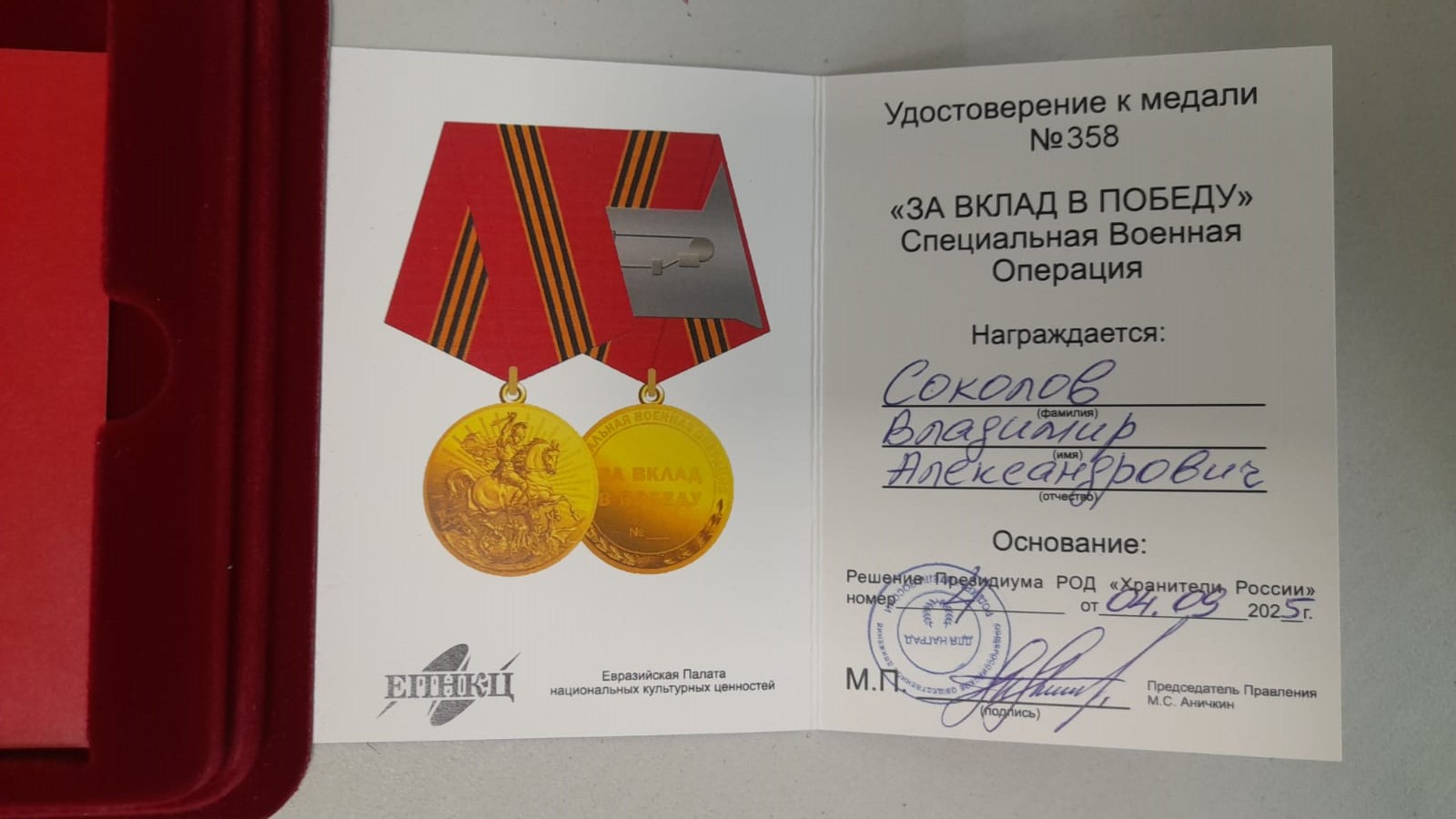 Награда учреждена Евразийской Палатой национальных культурных ценностей и выдается на основании решения Президиума Российского Общественного Движения «Хранители России». Подпись председателя Правления организации Михаила Сергеевича Аничкина на документах, сопровождающих награду, подтверждает высокий статус этого знака отличия.
